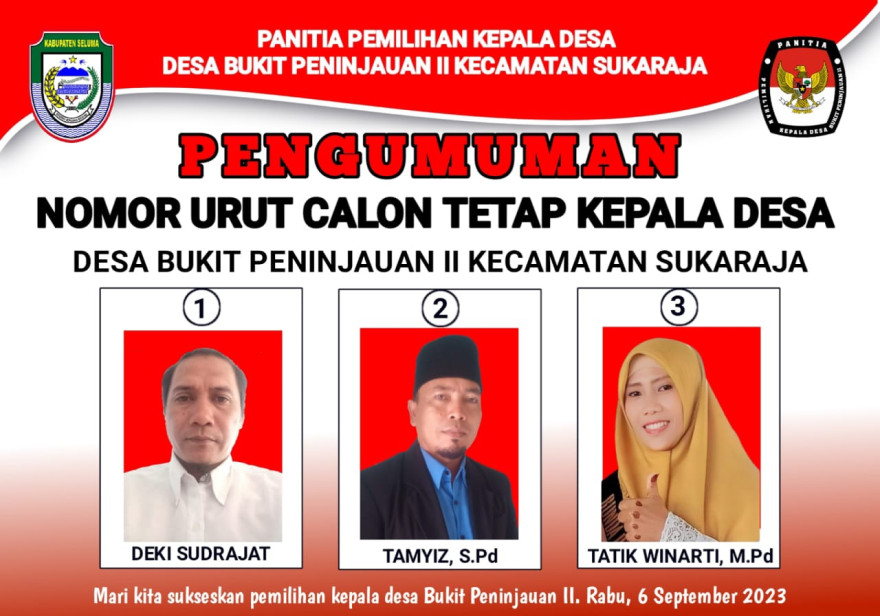 Desa Bukit Peninjauan II sukaraja  melalui panitia  pemilihan kepala Desa mengumumkan Nama dan Nomor urut Calon tetap Kepala ...